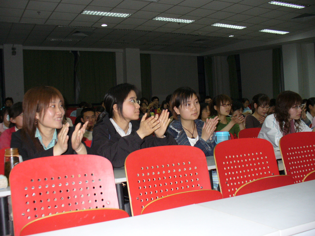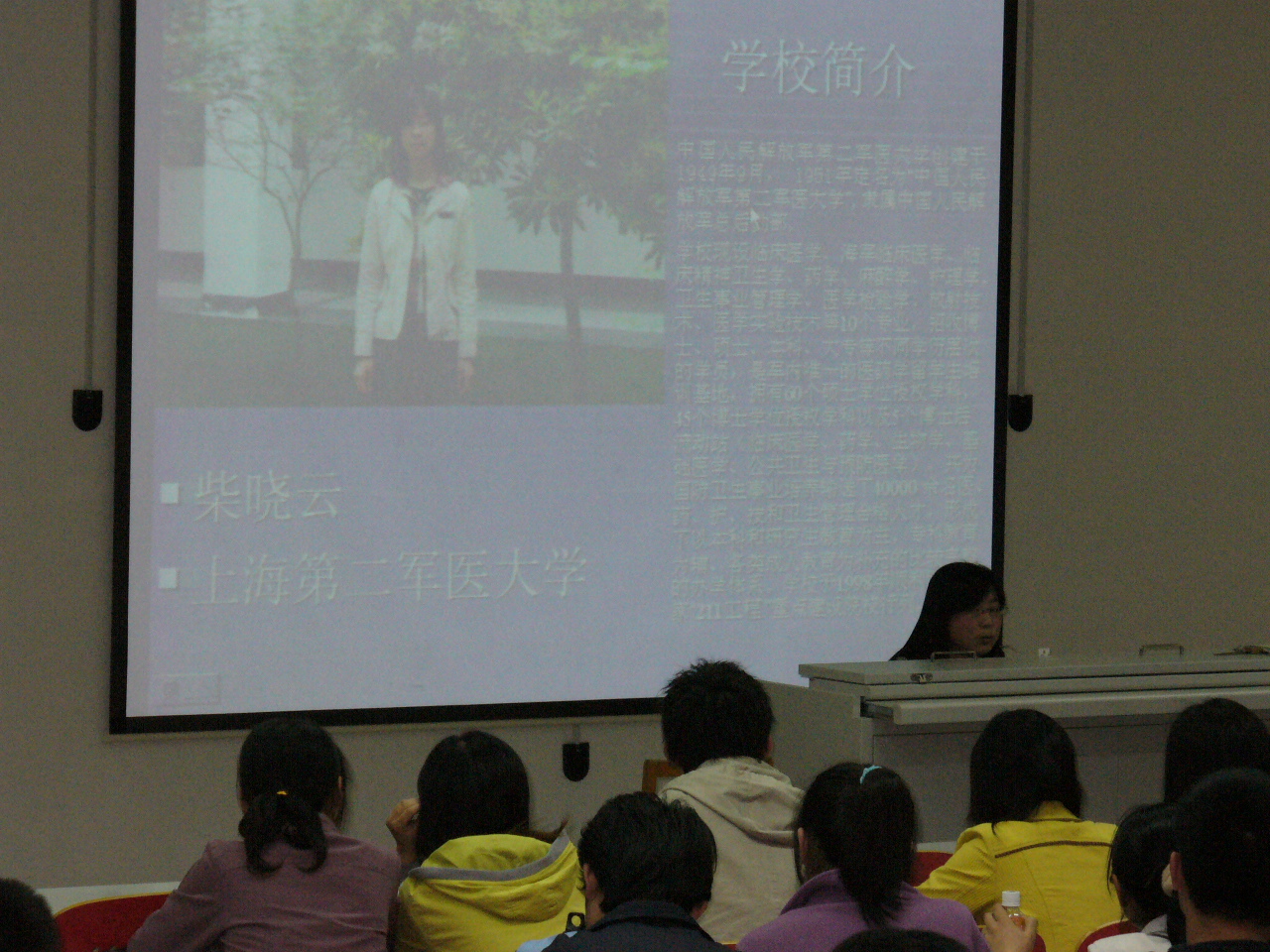 张婷(考取中国协和医科大学研究生)援引“付出不一定有收获,收获一定有付出”引起了同学们深深的反思。嘉宾们还纷纷向同学们介绍了自己的考验经历,尽管有很多人把自己的成功归结于幸运的眷顾,然而善于把握机会是她们取得成功至为关键的一步。左清磊同学(考取上海医工院研究生)以轻松幽默的语言,就如何面对复试总结了自己的经验,而考入中山大学的郭新铭同学将考研的准备过程,归纳为十个字,“眼力、动力、精力、耐力、财力”。最后由朱建勤同学(考取中国协和医科大学研究生)做了总结:“考研不是太难,只要坚持下去。”