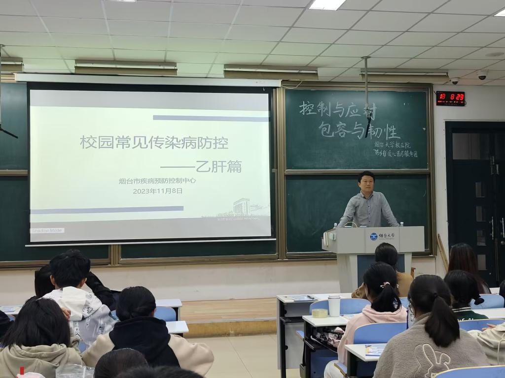 为使学子正确认识乙肝等常见传染病,提高在校大学生对传染病的防控意识,有效预防传染病在校内的传播。11月3日晚,“药乡行”爱心医疗服务团联合天美传媒 校医院于综合楼206开展主题为“控制与应对,包容与韧性”的大学生健康公益大讲堂。天美传媒 校医院副院长王淑珍、办公室主任徐信磊、预防保健科主任张玉琴、医生周丽霞,烟台市疾病预防控制中心免疫预防科科长、副主任医师陈鹏及学生代表参加本次讲座。