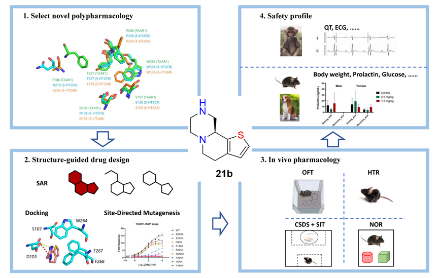 近日,天美传媒 /分子药理和药物评价教育部重点实验室田京伟/张剑钊/芦静团队与绿叶制药集团创新研究院,首次发现微量胺相关受体1 (Trace-amine associated receptor 1, TAAR1)和5-HT2C受体(5-hydroxytryptamine receptor 2C, 5-HT2CR)的相似结合模式,用于新一代治疗精分药物/阿尔茨海默病精神病性障碍等疾病研发。芦静带领药物设计团队基于人工智能药物设计和计算机辅助药物设计(AIDD/CADD)获得全球首个双靶点激动剂,表现出对TAAR1和5-HT2CR高特异性的强激动活性,在多种药效学模型展现出显著优于目前临床用药的特征;已在中国和美国进入临床I期多剂量递增(MAD)研究阶段,临床前和初步临床结果显示耐受性和安全性良好,未出现抗精分药物常见的锥体外系不良反应、血脂代谢异常、体重增加等副作用,被行业列为具有“重磅炸弹”潜力的分子。这一重要的科研成果不仅为精神分裂症和阿尔茨海默病精神病性障碍等患者提供了新的治疗选择,也为未来药物研发提供了创新策略。